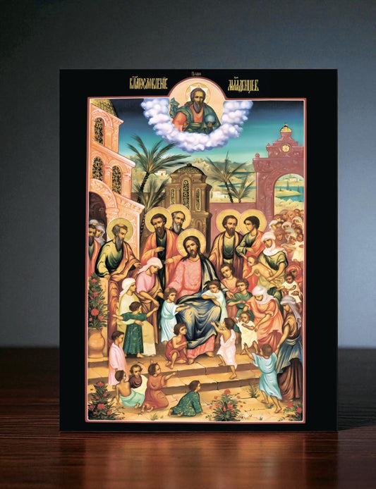 Lord Jesus Christ the Savior blesses the children ("Blessing of the Infants"). Wooden orthodox icon