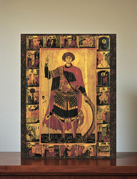 Saint George the Victorious icon with scenes from his life. Wooden orthodox icon