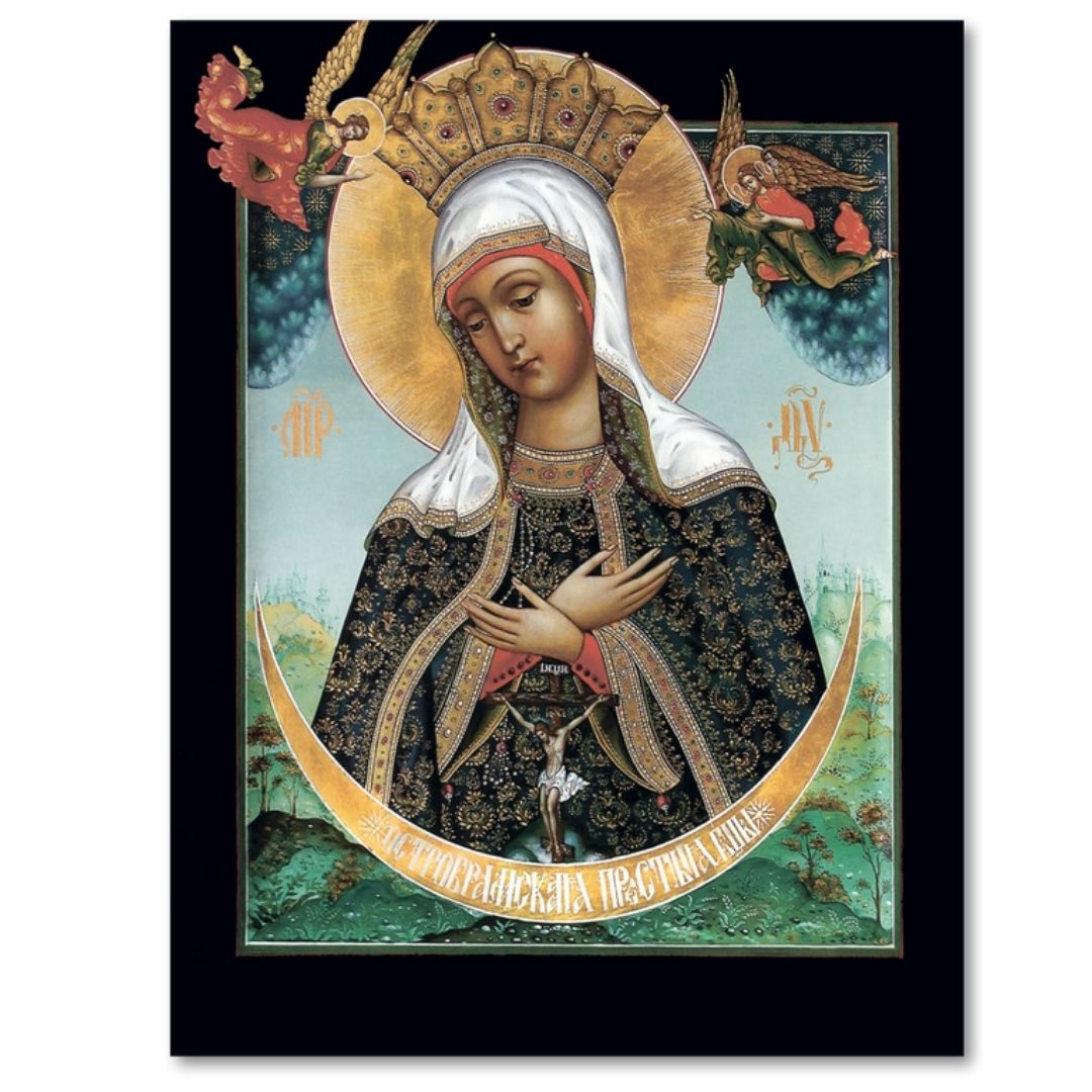 This stunning Orthodox icon depicts the Mother of God “Ostrobramskaya”, also known as Our Lady of the Gate of Dawn. This revered image originates from the famous shrine in Vilnius, Lithuania, and is venerated by both Orthodox and Catholic believers.