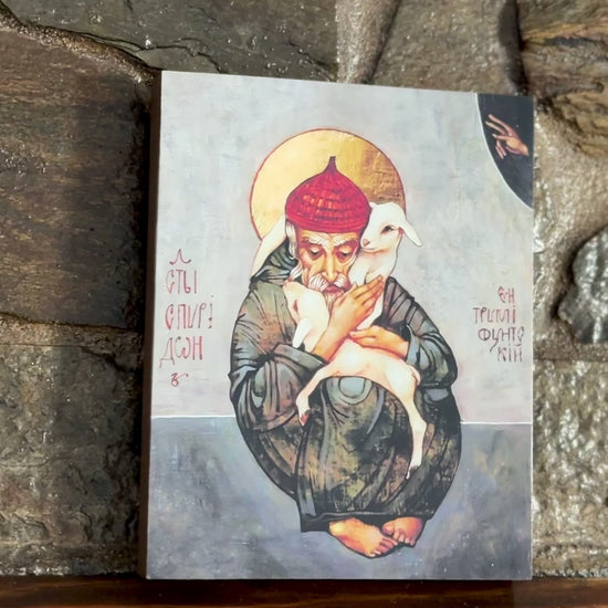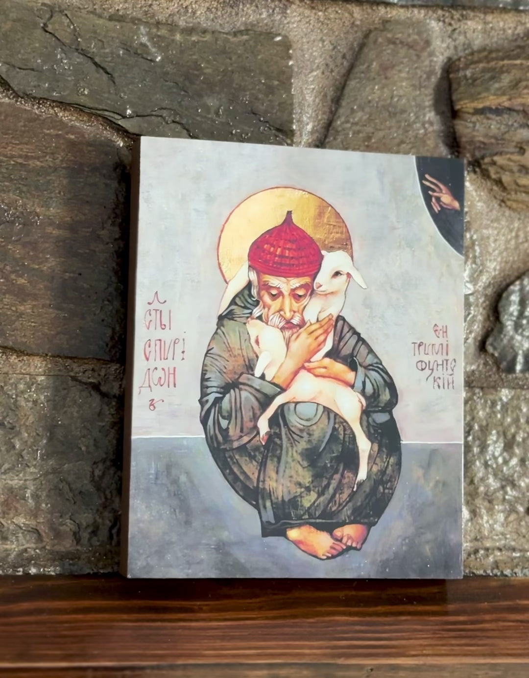 In the image, the saint is shown embracing sheep, a symbol of his pastoral care and spiritual fatherhood. Just as a shepherd tenderly guards his flock, Saint Spyridon cared for the souls entrusted to him, guiding them to Christ, the Good Shepherd. The sheep also remind us of Christ’s words: “My sheep hear My voice, and I know them, and they follow Me” (John 10:27).