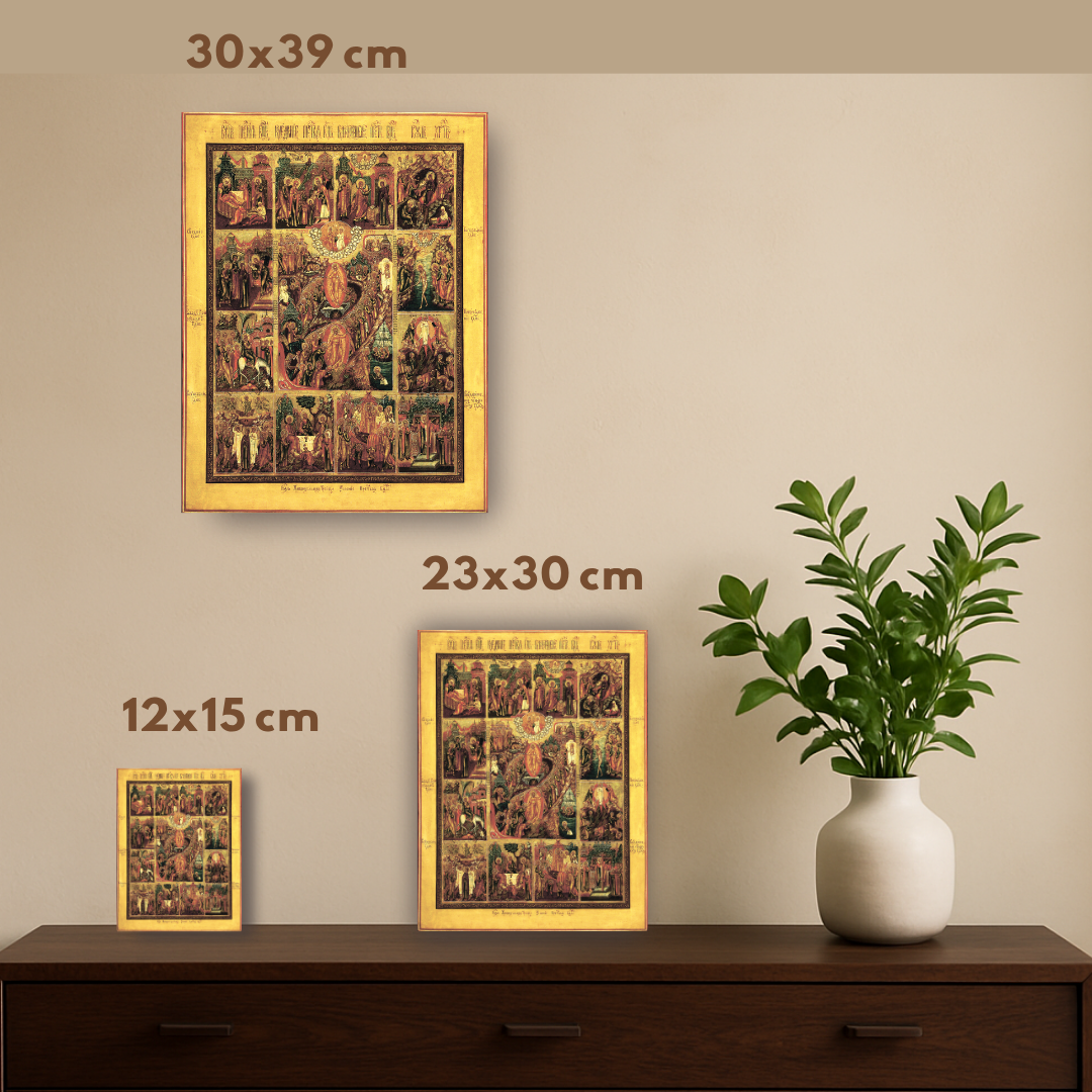 Wooden Icon of the Twelve Great Feasts and the Resurrection of Christ (Easter icon)
