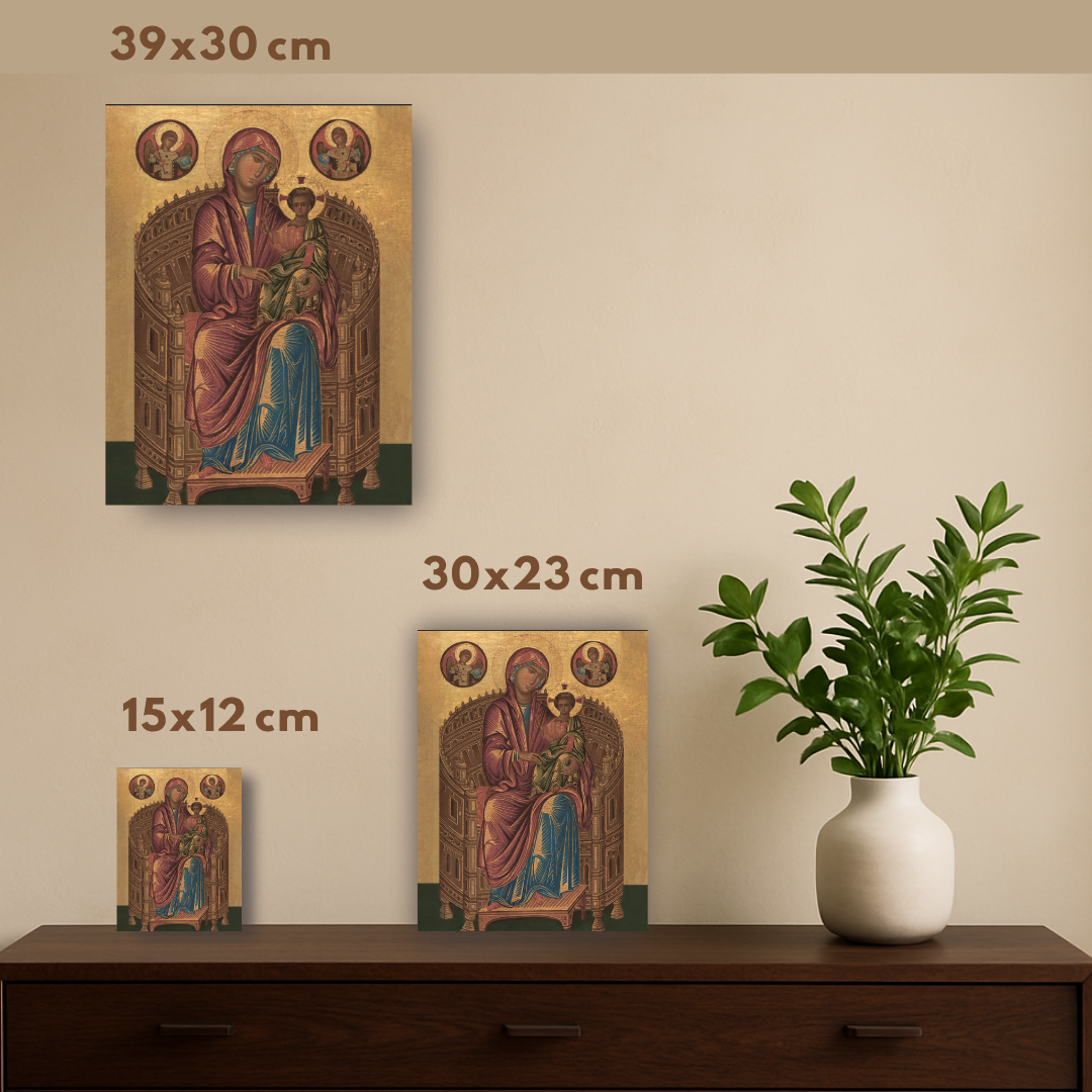 🕊️ This stunning Orthodox icon is a faithful reproduction of a rare 13th-century Byzantine masterpiece depicting the Mother of God Hodegetria (“She Who Shows the Way”) seated on a throne, holding the Christ Child. Rooted in the Constantinopolitan school of iconography, this image expresses deep spiritual symbolism and imperial majesty.