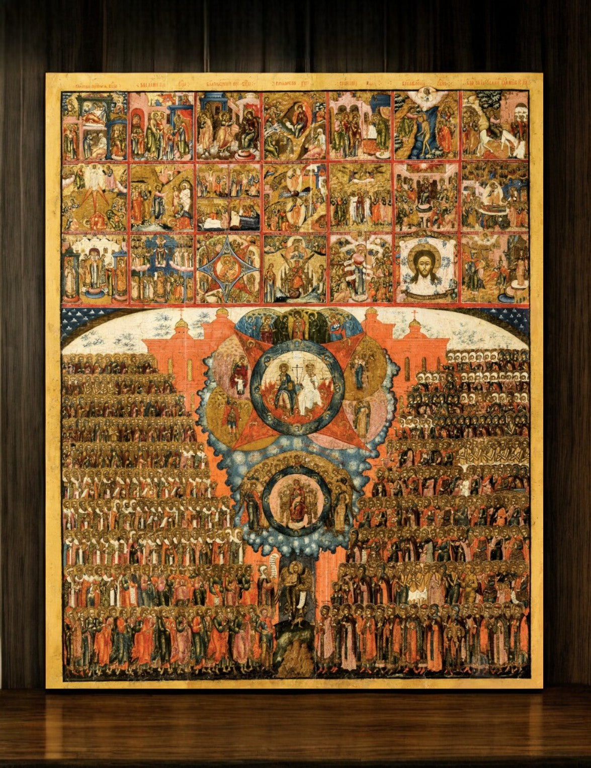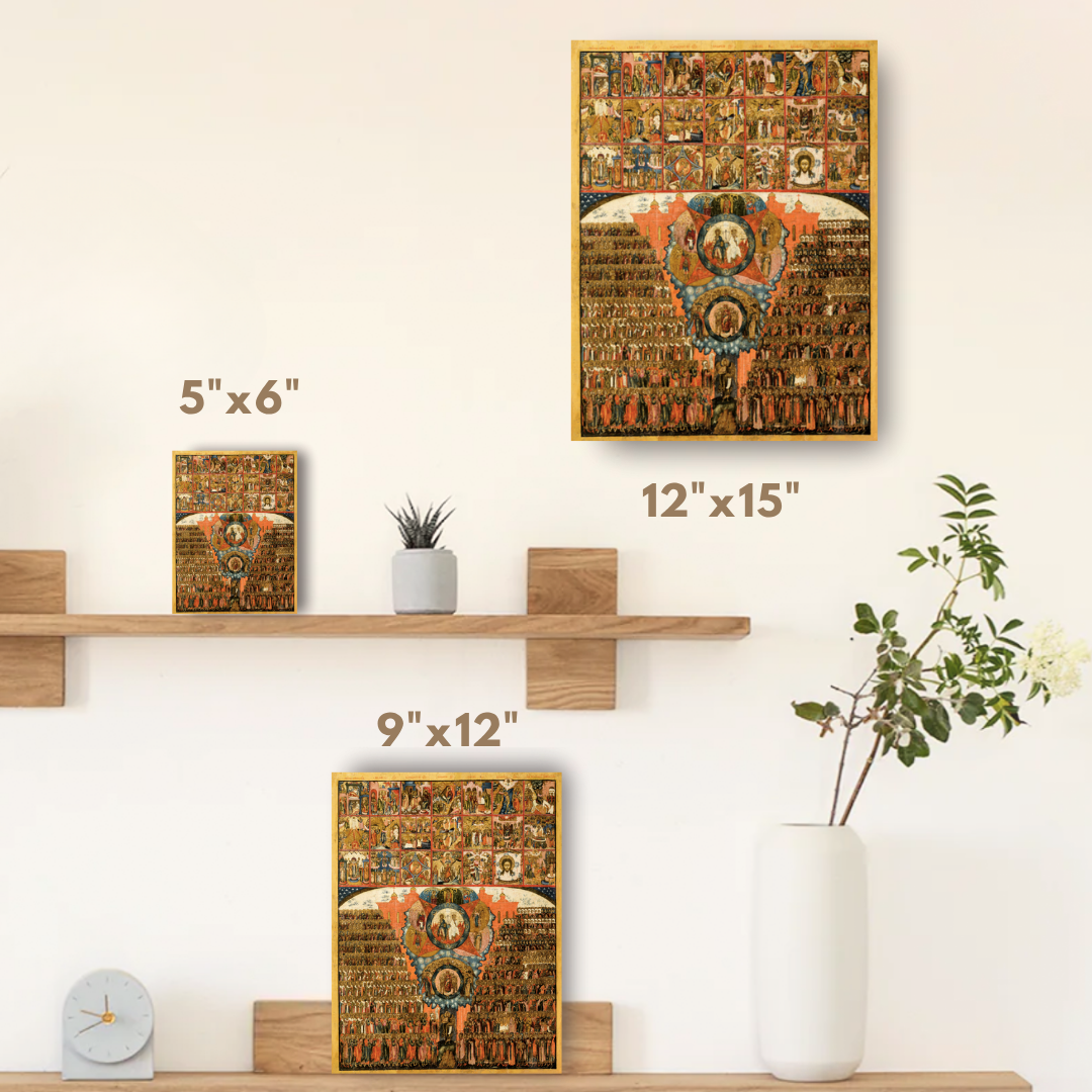This exceptional Orthodox icon presents the Synaxis of All Saints — a grand vision of saints, angels, and the righteous worshiping the Holy Trinity, based on a 19th-century original from the Museum of the History of Religion in Saint Petersburg.