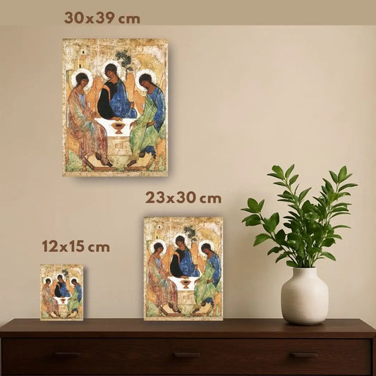The Holy Trinity by Andrei Rublev. Wooden orthodox icon