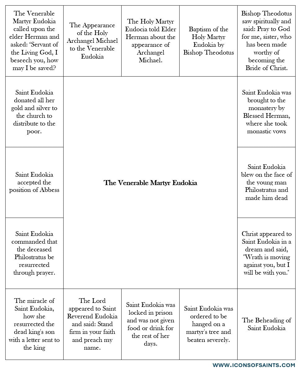 Saint Venerable Martyr Eudokia of Heliopolis with scenes from her life. Wooden orthodox icon.