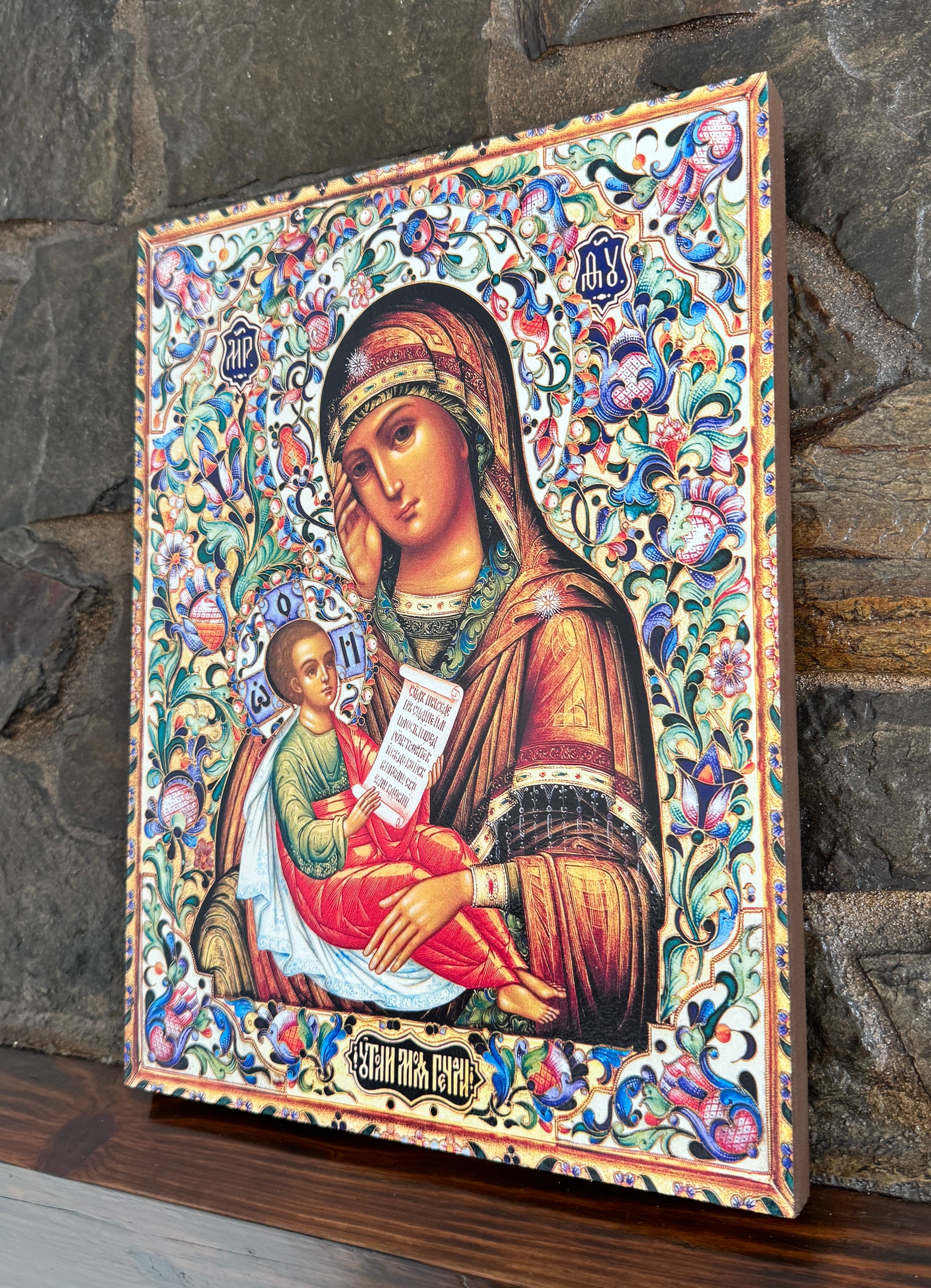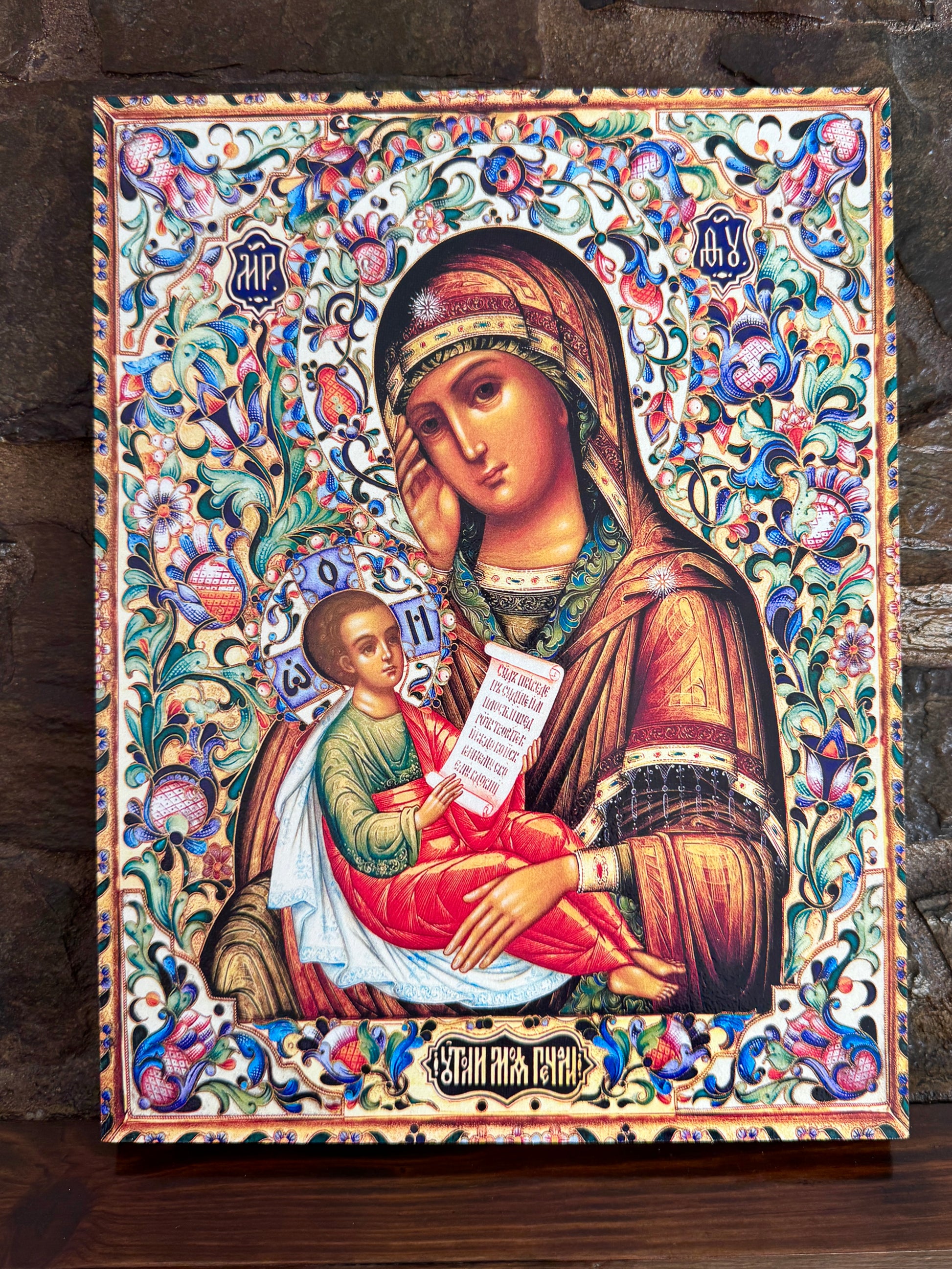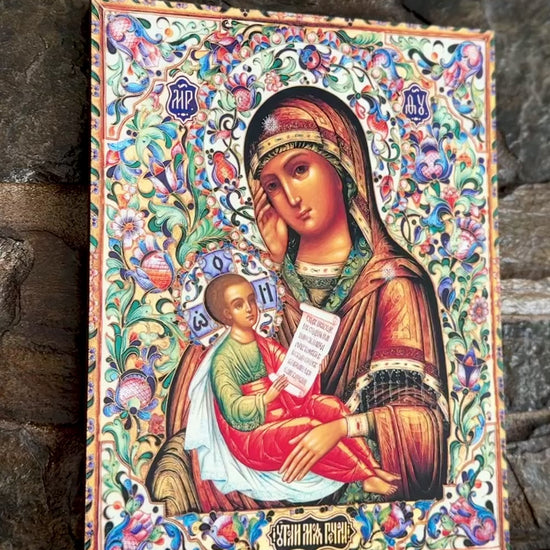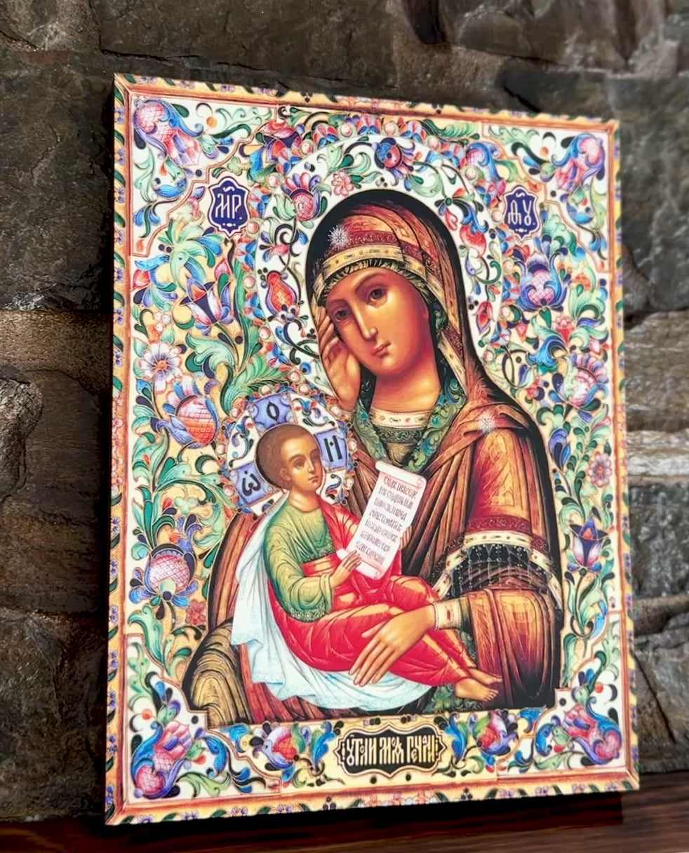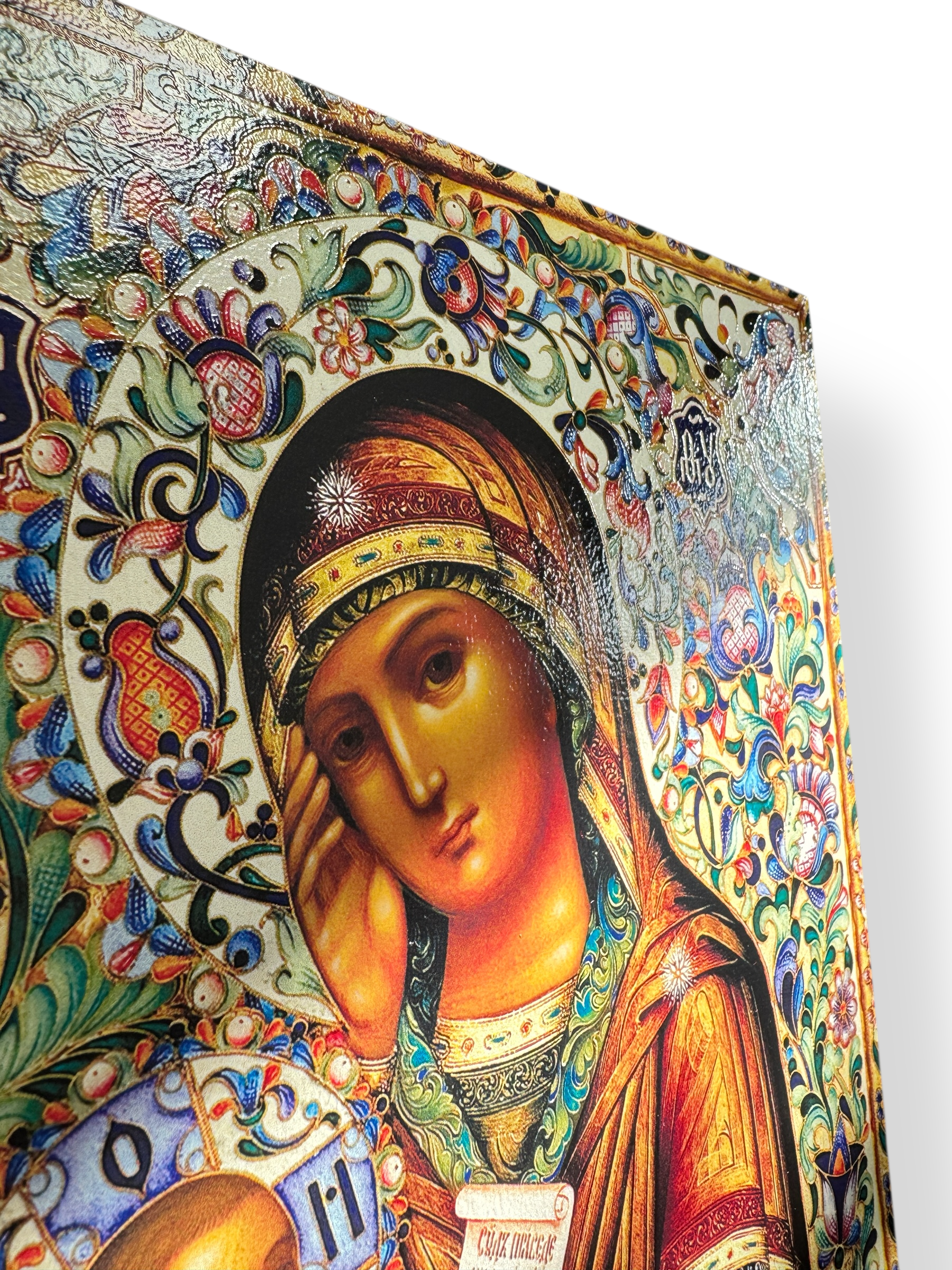 O ícone é feito por impressão em placa de madeira. As tintas são minerais, não desbotam com o tempo. A espessura da placa é de 2 cm. A tábua é coberta com terra manualmente. A imagem está coberta de cera. Cada ícone possui um suporte de metal na parte traseira para que você possa pendurá-lo na parede.
