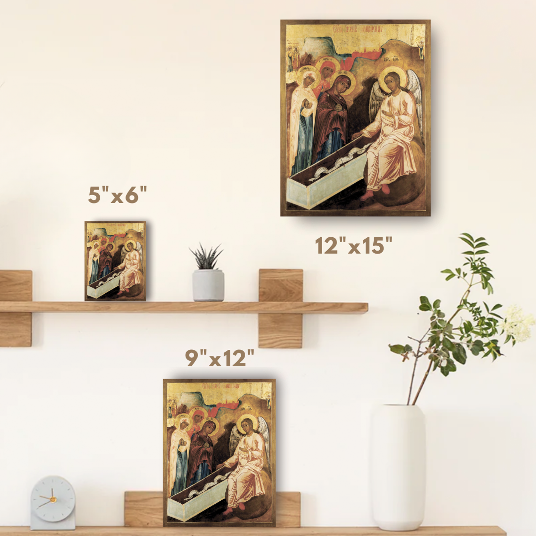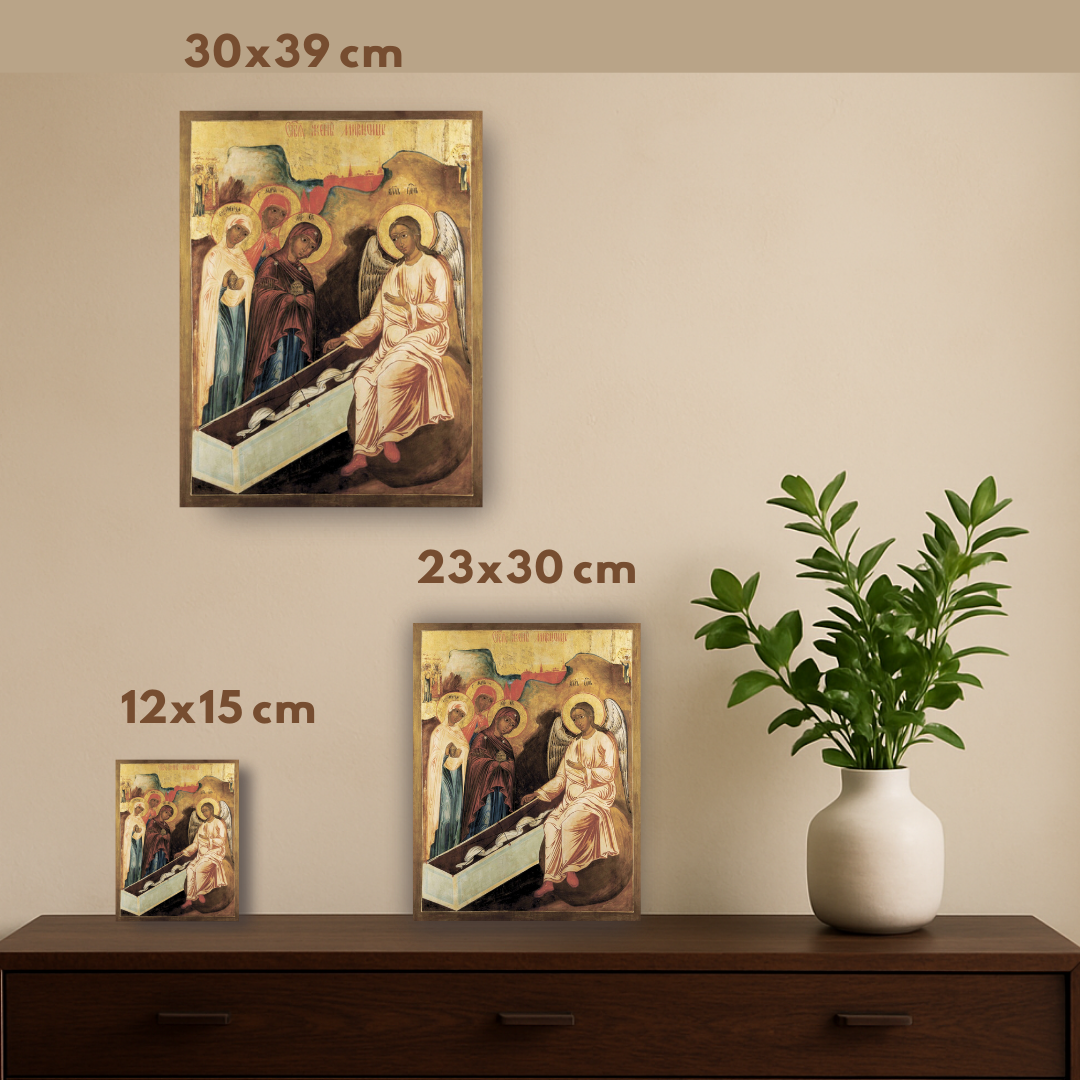 O ícone retrata os acontecimentos do Evangelho na manhã da Ressurreição. Nessa manhã, várias mulheres, entre os discípulos, aproximaram-se da gruta onde estava depositado o corpo de Jesus Cristo. Queriam ungir o Seu corpo com incenso, a preciosa mirra, segundo o antigo costume. Estas mulheres são glorificadas como santas e conhecidas como as Mulheres Miróforas.