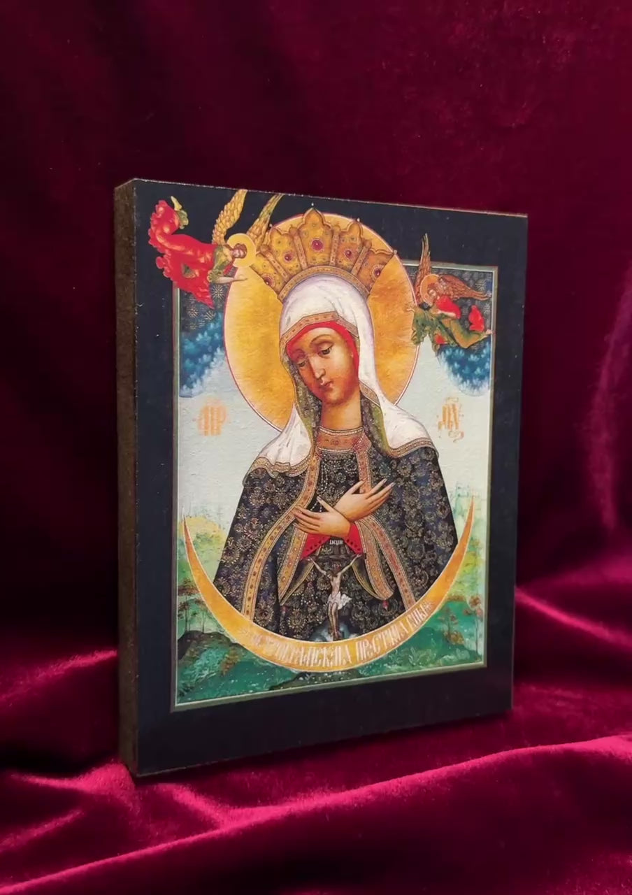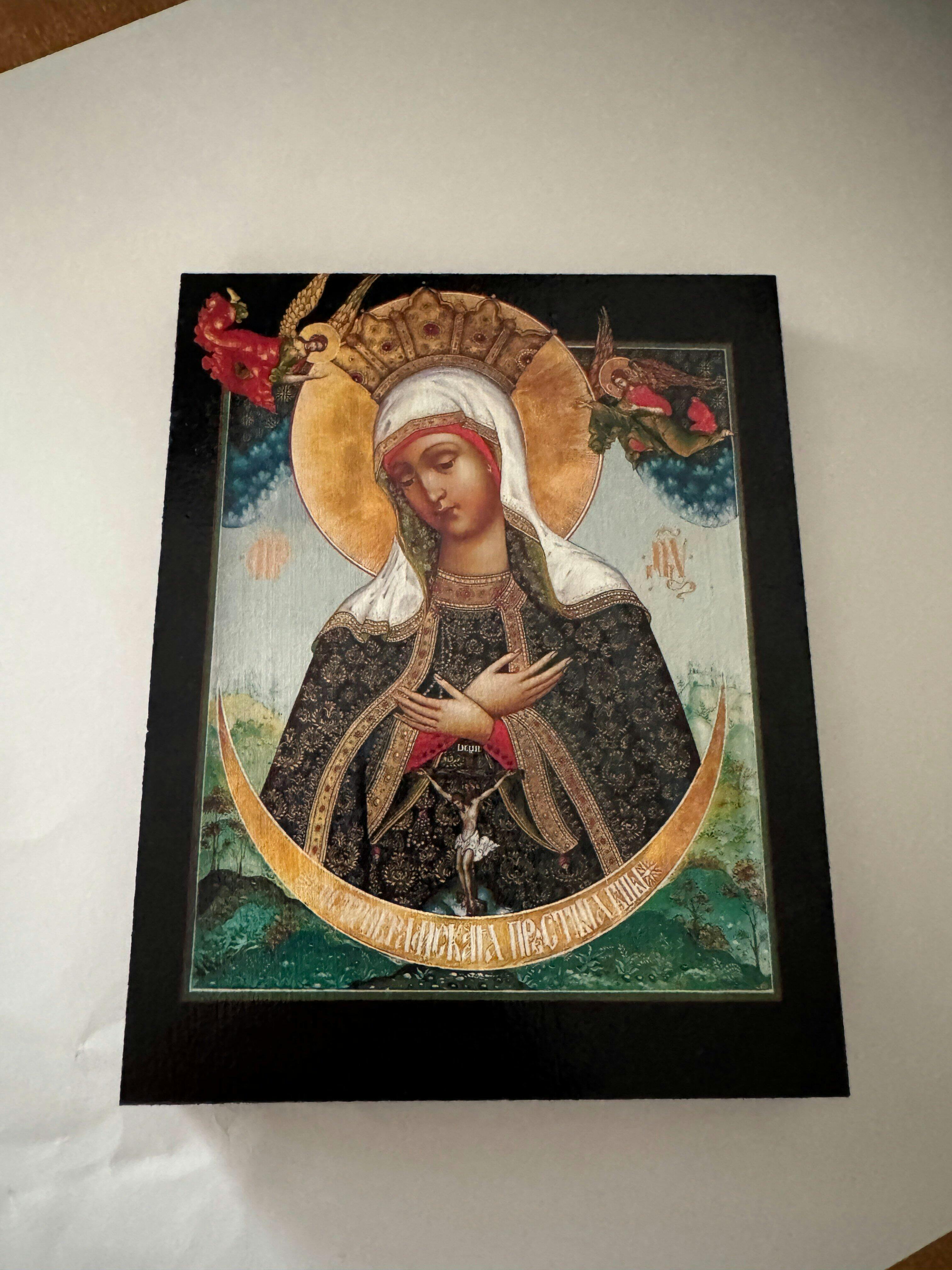 O ícone é feito por impressão em placa de madeira. As tintas são minerais, não desbotam com o tempo. A espessura da placa é de 2 cm. A tábua é coberta com terra manualmente. A imagem está coberta de cera. Cada ícone possui um suporte de metal na parte traseira para que você possa pendurá-lo na parede.